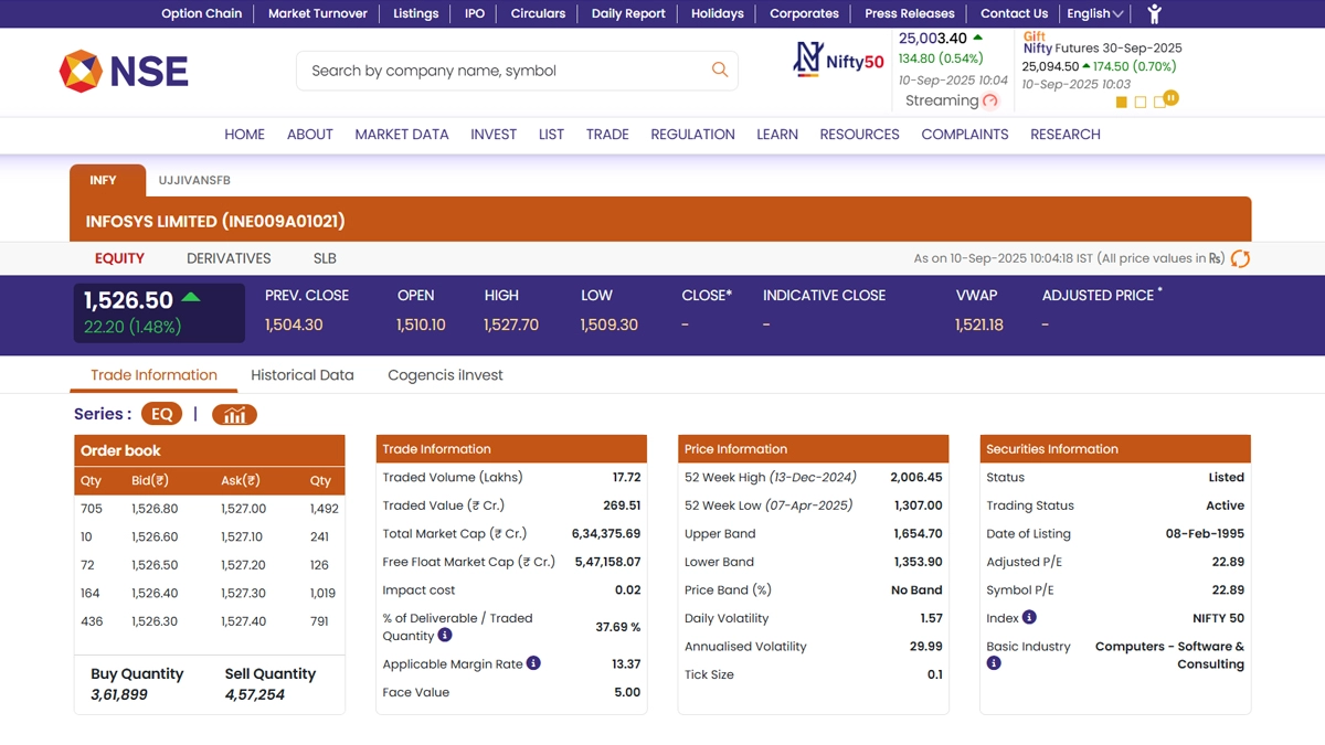 Just a day ahead of its board meeting to discuss a potential share buyback, Infosys Ltd (NSE: INFY) shares rose 1.48% in early trade on Wednesday, September 10. The stock opened at INR 1,510.10 against its previous close of INR 1,504.30 and was trading at INR 1,526.50 by 10:05 AM, up INR 22.20. The rise comes as investors anticipate the board considering a buyback proposal at its September 11 meeting, following the company’s last INR 9,300-crore buyback in 2022, when around 50.27 million shares were repurchased. A share buyback allows a company to reduce outstanding shares in the market, often boosting earnings per share and shareholder value. Infosys, India’s second-largest IT services firm, has historically used buybacks to reward investors and optimize its capital structure. The stock currently trades well above its 52-week low of INR 1,307.00, though still below the 52-week high of INR 2,006.45, reflecting cautious optimism ahead of the board decision. Ujjivan Small Finance Bank Share Price Today, September 10: Ujjivan Small Finance Bank Stock Rise 2% Amid Plans To Raise INR 2,000 Crore via QIP and Await RBI Universal Banking License.