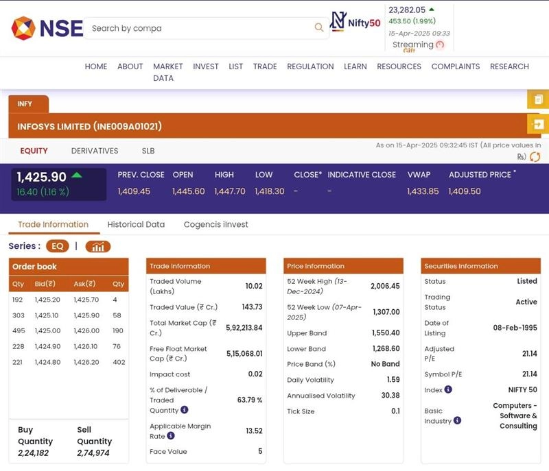Stocks of Infosys Limited (NSE: INFY) opened in green today, April 12, during the early morning trade. According to the National Stock Exchange (NSE) website, shares of Infosys Limited (NSE: INFY) were trading at INR 1,425.90 and dose by INR 16.40, or 1.16%. Infosys is set to announce its results for the fourth quarter and financial year 2024–25 this week. The company has already communicated the detailed schedule for the announcement of its Q4 and FY25 financial results. Stocks To Buy or Sell Today, April 15, 2025: Reliance Industries, Greaves Cotton, Delhivery and Vedanta Among Shares That May Remain in Focus on Tuesday.