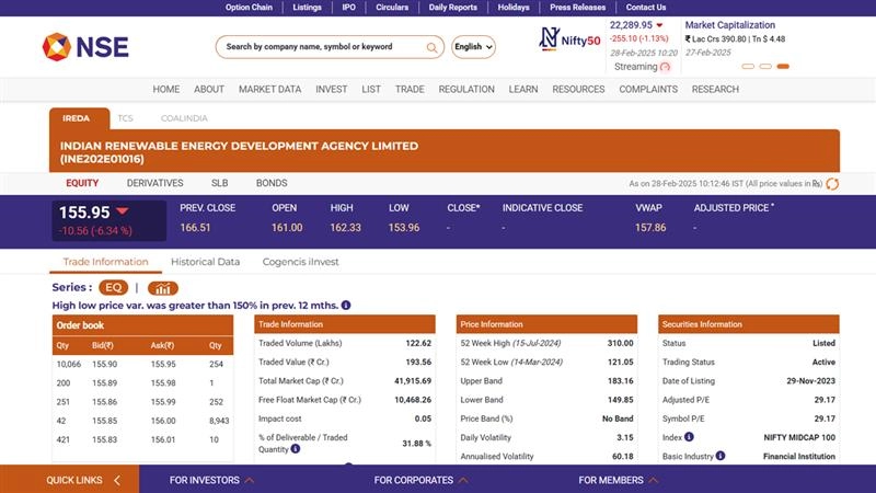 Shares of Indian Renewable Energy Development Agency Ltd (NSE: IREDA) fell by over 6 per cent on February 28, opening at INR 161.00, down from the previous close of INR 166.51. During early trade, the stock dropped to INR 155.95, a loss of 6.34 per cent. Despite recent gains in four out of the last five trading sessions, IREDA’s stock has corrected more than 20 per cent in February, marking its steepest decline since its listing. TCS Share Price Today, February 28: Shares of Tata Consultancy Services Drops 2.85% Amid Market Sell-Off, Check Latest Price on NSE and BSE.