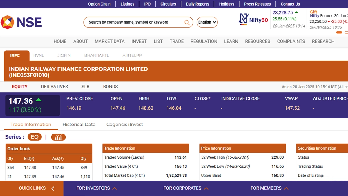 Indian Railway Finance Corporation Limited (NSE: IRFC) stocks opened in green today, January 20 and were trading at INR 147.36. According to the latest trading updates on the National Stock Exchange (NSE) website, Indian Railway Finance Corporation Limited (NSE: IRFC) shares saw a rise of INR 1.17 or 0.80 per cent from the previous day's closing of INR 146.19. The Indian Railway Finance Corporation Limited (NSE: IRFC) stock saw its 52-week high and low of INR 229 and INR 116.65 on July 15 and March 14 last year, respectively. RVNL Share Price Today, January 20: Stocks of Rail Vikas Nigam Limited Open in Green in Early Trade, Rise by 1.55%.