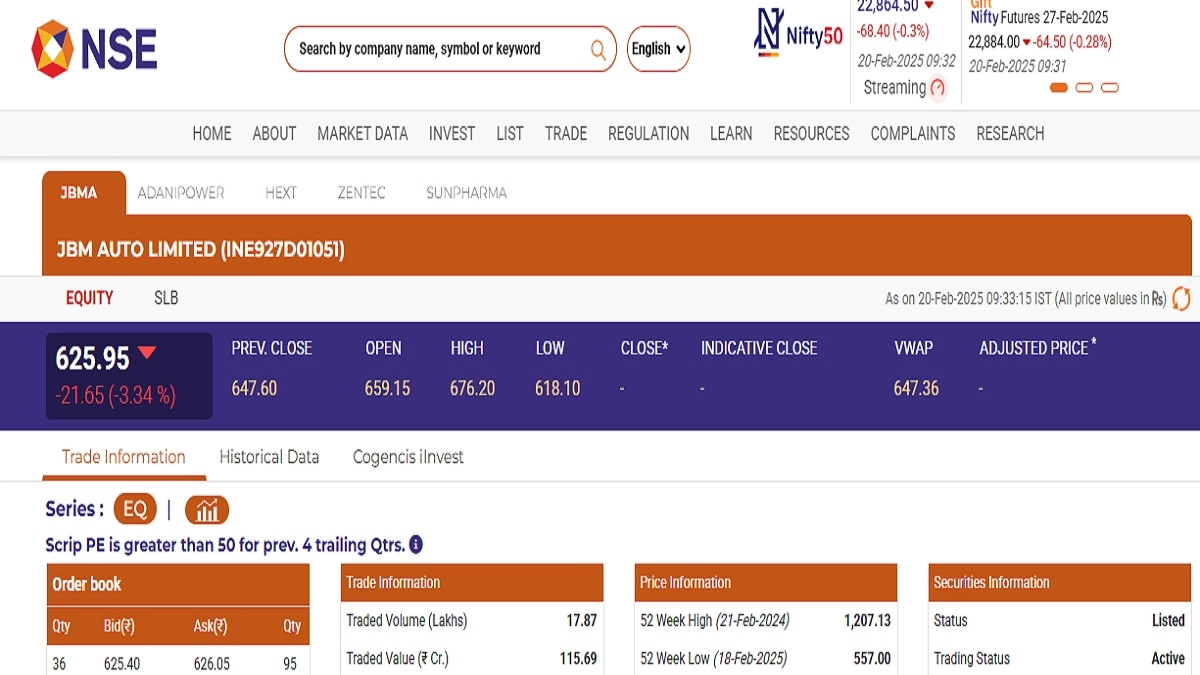 Stocks of JBM Auto Limited (NSE: JBMA) opened in red today, February 20, in the early morning trade. As per the latest trading updates, JBM Auto Limited (NSE: JBMA) shares were trading at INR 625.95 and fell by INR 21.65 or 3.34 per cent. JBM Auto Limited (NSE: JBMA) saw its 52-week high of INR 1,207.13 on February 21 last year and a 52-week low of INR 557 on February 18 this year. Stocks To Buy or Sell Today, February 20, 2025: Mahindra Group, Orchid Pharma, Torrent Power Among Shares That May Remain in Focus on Thursday.