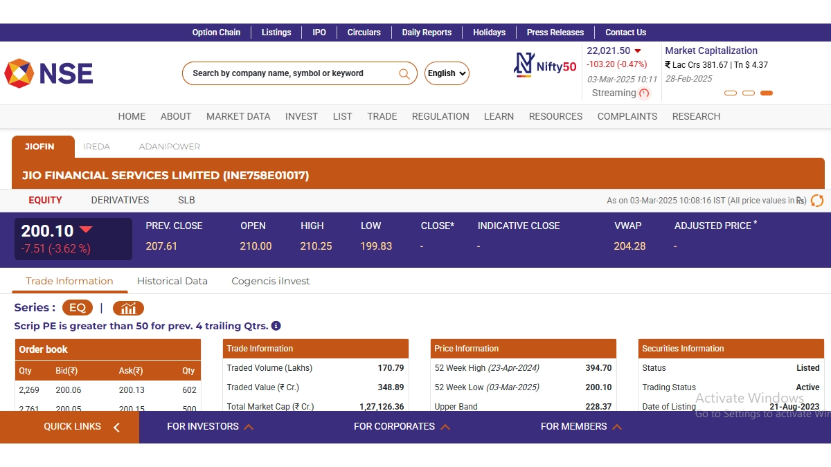Shares of Jio Financial Services Limited (NSE: JIOFIN) opened on a negative note today, March 3. According to the latest trading updates, stocks of Jio Financial Services Limited (NSE: JIOFIN) were trading at INR 200.10 and saw a decline of INR 7.51 or 3.62 percent. Notably, Jio Financial Services Limited (NSE: JIOFIN) saw its 52-week high of INR 394.70 on April 23 last year. IREDA Share Price Today, March 3: Stocks of Indian Renewable Energy Development Agency Limited Fall by 3.99% in Early Trade, Check Latest Price on NSE.
