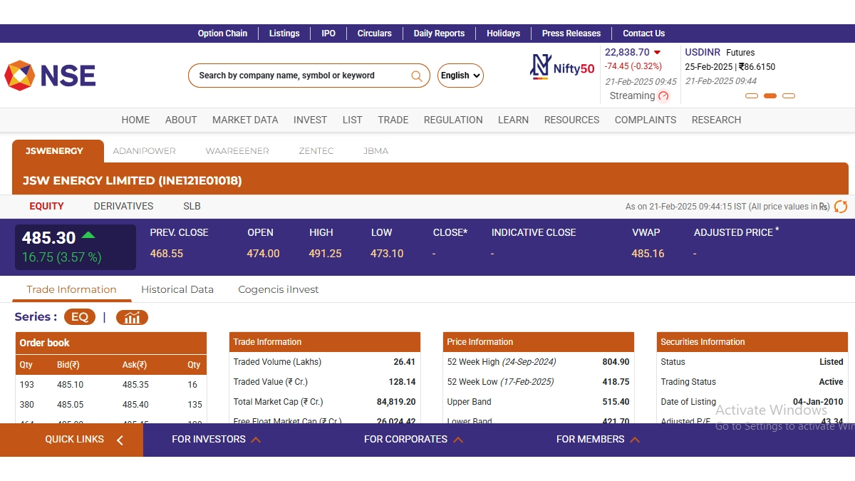 Stocks of JSW Energy Limited (NSE: JSW Energy) opened in green today, February 21, as the stock market opened for business. In the early morning trade, shares of JSW Energy Limited (NSE: JSW Energy) were trading at INR 485.30 and rose by INR 16.75 or 3.57 per cent. Notably, JSW Energy Limited (NSE: JSW Energy saw its 52-week high of INR 804.90 on September 24 last year. Stocks To Buy or Sell Today, February 21, 2025: Tata Steel, ONGC, Kotak Mahindra Bank Among Shares That May Remain in Focus on Friday.