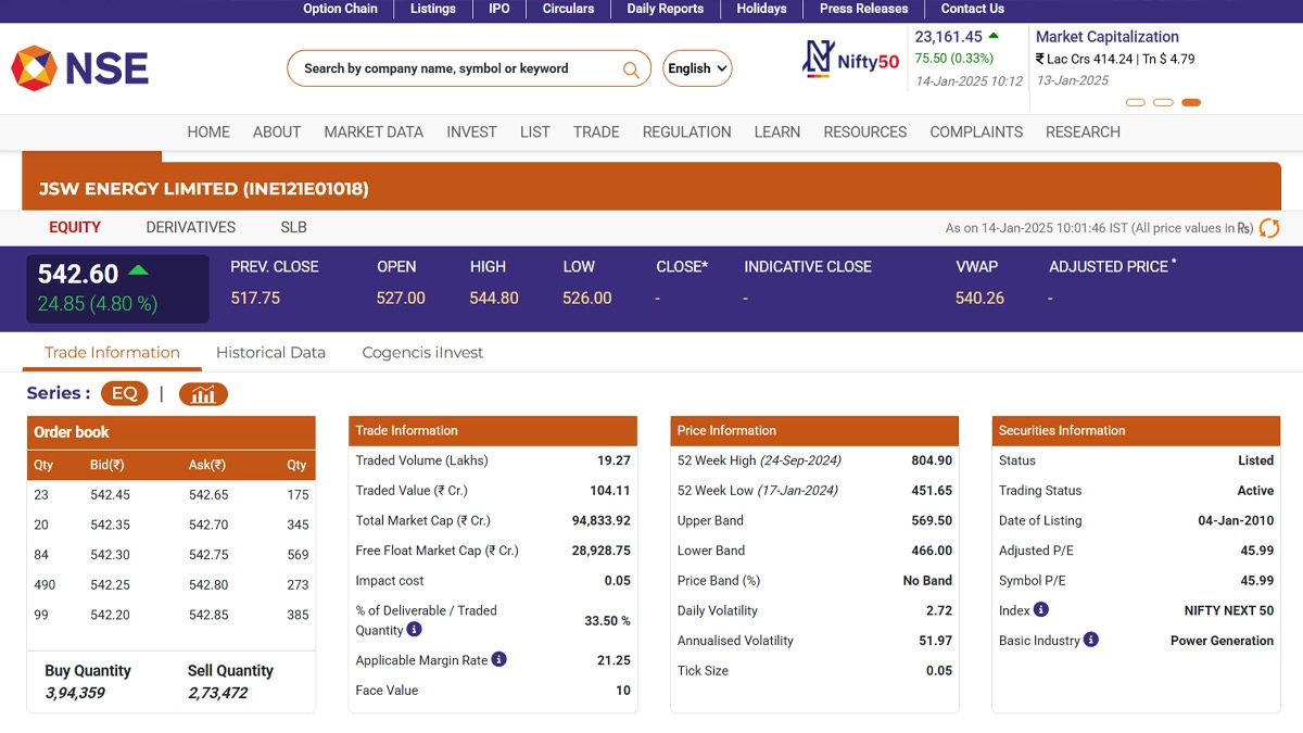 Shares of JSW Energy (NSE: JSWENERGY) saw a notable jump of 4.8 per cent today, January 14, opening at INR 527.00, up from the previous close of INR 517.75.