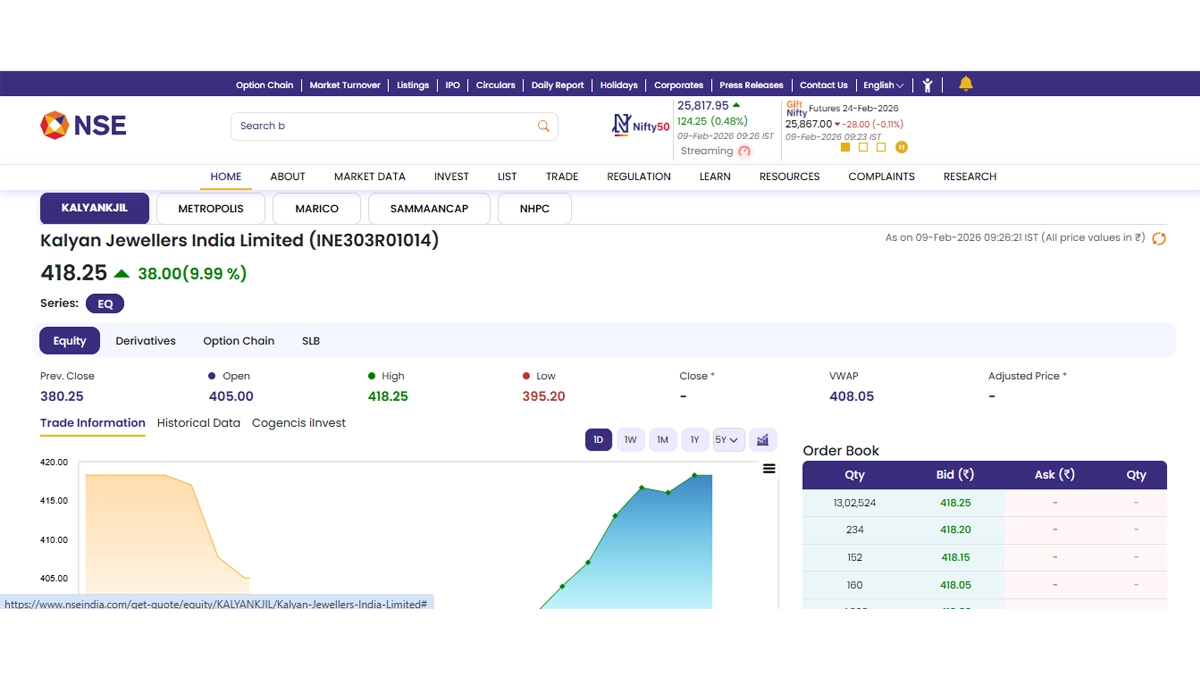 Stocks of Kalyan Jewellers India Limited (NSE: KALYANKJIL) opened in green today, February 9, as soon as the stock market opened for business. According to the National Stock Exchange (NSE) website, shares of Kalyan Jewellers India Limited (NSE: KALYANKJIL) were trading at INR 418.25 and rose by INR 38 or 9.99 per cent. Notably, Kalyan Jewellers India Limited (NSE: KALYANKJIL) stocks saw their 52-week high of INR 617.70 on July 24 last year and 52-week low of INR 347.50 on January 27 this year. Stocks to Buy or Sell Today, February 9, 2026: HAL, Tata Motors, Bharat Forge Among Shares Likely to Remain in Spotlight on Monday.