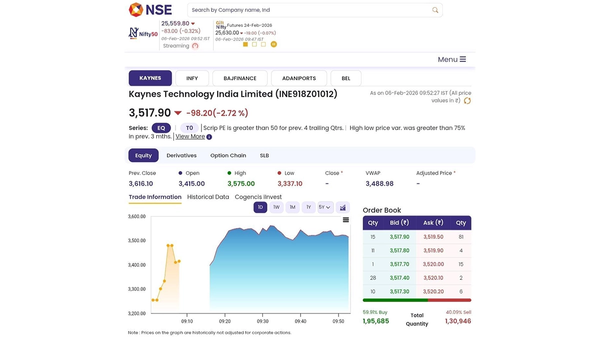Shares of Kaynes Technology India Limited (NSE: KAYNES) dropped in early trade on Friday, February 6, losing nearly 2.72%. The stock was trading at INR 3,517.90, down by INR 90.20 on the NSE at around 9:55 am IST. The company reported its third-quarter results after market hours on February 5. It was a troubling quarter for Kaynes, as it missed estimates on all fronts. In its latest note, Jefferies has noted the earnings miss from Kaynes Tech in the December quarter, highlighting a noticeable slowdown in the industrial sales division, while operating margins missed estimates. Stocks to Buy or Sell Today, February 6, 2026: LIC, Bharti Airtel, Hero MotoCorp Among Shares Likely to Remain in Spotlight on Friday.