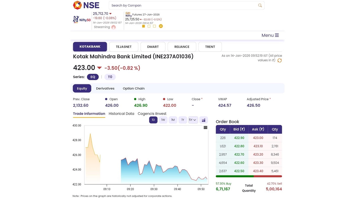 The share price of Kotak Bank (NSE: KOTAKBANK) opened in the red on Wednesday, January 14, 2026. The Kotak Bank Limited (NSE: KOTAKBANK) stock was trading lower in early market hours on Wednesday, January 14, 2026. The stock was quoted at INR 423, up INR 3.50 or 0.83%. The drop in Kotak Bank shares came after the lender began trading adjusted for its stock split announced earlier. Kotak Mahindra Bank has divided one share of INR 5 into five shares of INR 1 each. The record date for the stock split was fixed for January 14. Stocks to Buy or Sell Today, January 14, 2026: ICICI Lombard, Indian Overseas Bank and Just Dial Among Shares That May Remain in Spotlight on Wednesday.