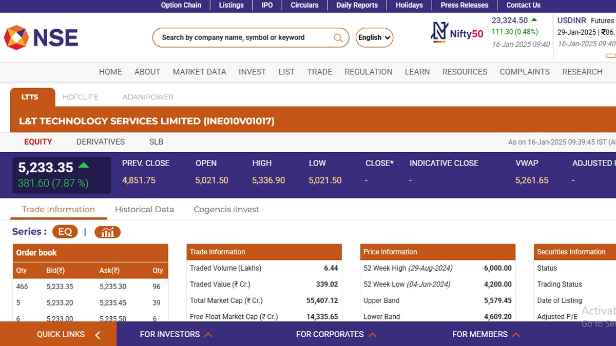 The shares of L&T Technology Services Limited (NSE: LTTS) opened on a positive note today, January 16. According to the latest trading updates on the National Stock Exchange (NSE), L&T Technology Services Limited (NSE: LTTS) was trading at INR 5,233.35 and saw a rise of INR 381.60 or 7.87 per cent. Notably, L&T Technology Services Limited (NSE: LTTS) saw its 52-week high of INR 6,000 on August 29 last year. HDFC Life Share Price Today, January 16: Stocks of HDFC Life Insurance Company Limited Rise by INR 51.55 After Q3 Profit Rises 14% to INR 415 Crore.