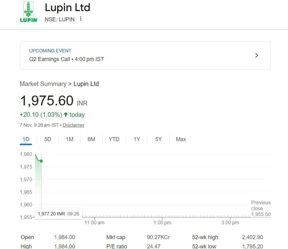 Shares of Lupin Ltd (NSE: LUPIN) rose 1.03% to INR 1,975.70 in early trade on Thursday after the pharma major reported a stellar 73.3% YoY jump in consolidated profit to INR 1,477.9 crore for Q2 FY25. Revenue surged 24.2% to INR 7,047.5 crore, led by robust U.S. sales and improved margins. The upbeat earnings lifted investor sentiment, driving the stock higher on the NSE. Lupin’s Q2 earnings call is scheduled for 4:00 pm IST, with market participants closely watching management commentary on growth outlook and US business momentum. Stocks to Buy or Sell Today, November 7, 2025: RVNL, Bajaj Housing Finance, and Crompton Greaves Among Shares That May Remain in Spotlight on Friday.