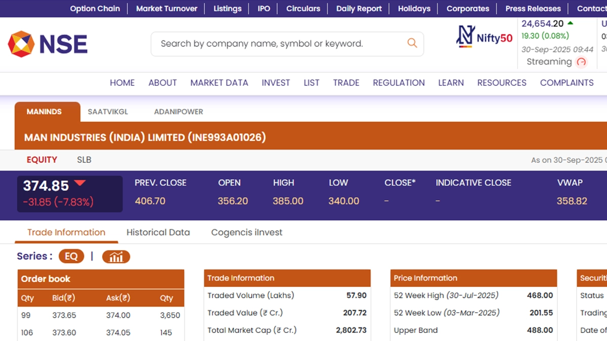 Stocks of Man Industries (India) Limited (NSE: MANINDS) opened on a negative note today, September 30, after the Indian stock market opened for business. According to the National Stock Exchange (NSE) website, the stocks of Man Industries (India) Limited (NSE: MANINDS) were trading at INR 374.85 and fell by INR 31.85 or 7.83 per cent. Notably, Man Industries (India) Limited (NSE: MANINDS) saw their 52-week high and low of INR 468 and INR 201.55 on July 30 and March 30 this year, respectively. Stocks To Buy or Sell Today, September 30, 2025: Mahindra and Mahindra, IRFC, JSW Infra Among Shares That May Remain in Focus on Tuesday.