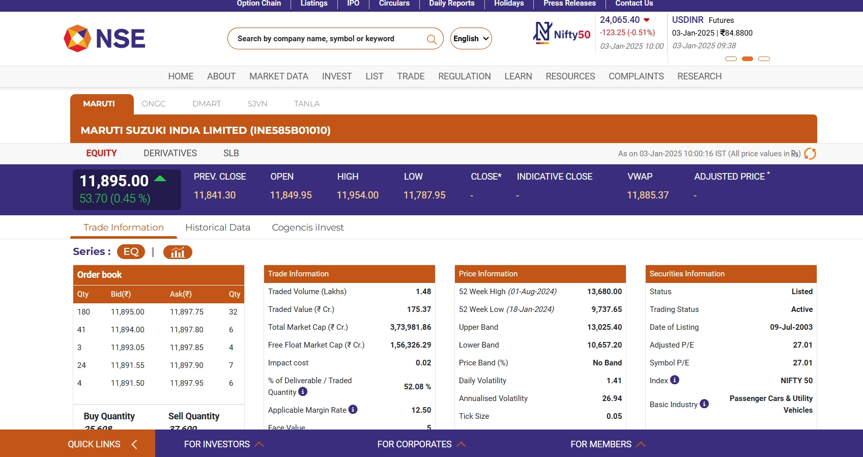 Maruti Suzuki India Ltd share price (NSE: Maruti) rose 0.69% to INR 11,922.70 as of 10:02 am on January 3, reflecting an increase of INR 81.40. The stock’s positive movement highlights investor optimism in the automobile giant. Maruti Suzuki continues to attract attention on the NSE and BSE, driven by its strong market position and steady performance. Traders are closely watching the stock for further developments, considering its consistent role as a leader in India’s automotive industry. Stocks To Buy or Sell Today, January 3, 2025: NHPC, Biocon and Varun Beverages Among Shares Expected To Remain in Focus on Friday.