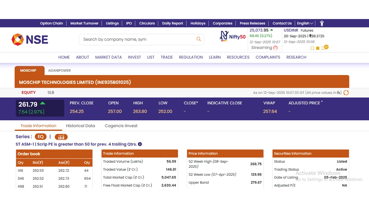 Shares of Moschip Technologies Limited (NSE: MOSCHIP) opened on a positive note today, September 12. As per the latest stock market updates on the National Stock Exchange (NSE), shares of Moschip Technologies Limited (NSE: MOSCHIP) were trading at INR 261.79. Stocks of Moschip Technologies Limited (NSE: MOSCHIP) saw a growth of INR 7.54 or 2.97 per cent in early trade. Moschip Technologies Limited (NSE: MOSCHIP) stocks saw their 52-week high of INR 268.75 on September 8 and low of INR 129.98 on April 7 this year. Adani Power Share Price Today, September 12: Stocks of Adani Power Limited Rise by 3.11% in Early Trade, Check Latest Price on NSE.