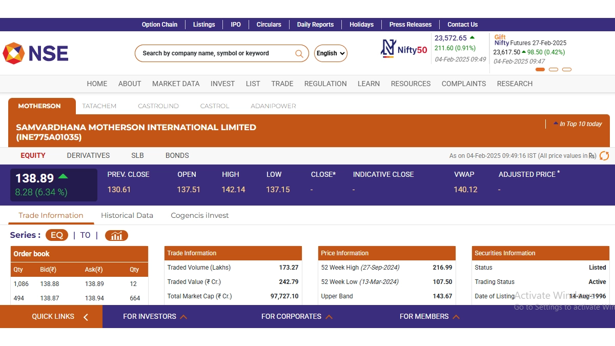 Stocks of Samvardhana Motherson International Limited (NSE: Motherson) opened in green today, February 4, and were trading at INR 138.89. Notably, Samvardhana Motherson International Limited (NSE: Motherson) shares saw a rise of INR 8.28 or 6.34 per cent, according to the National Stock Exchange (NSE) websites. Samvardhana Motherson International Limited (NSE: Motherson) saw its 52-week high of INR 216.99 on September 27 last year. Tata Chemicals Share Price Today, February 4: Stocks of Tata Chemicals Limited Fall INR 37.80 in Early Trade.