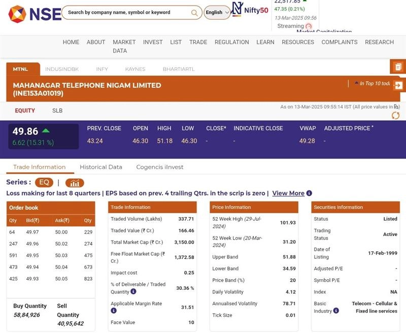 Stocks of MTNL (NSE: MTNL) opened in green today, March 13, during the early morning. According to the National Stock Exchange (NSE) website, shares of Mahanagar Telephone Nigam Limited (NSE: MTNL) were trading at INR 49.86 and rose by INR 6.62, or 15.31%. Indusind Bank Share Price Today, March 13: Stocks of Indusind Bank Limited Rise by 1.17% in Early Trade, Check Latest Price on NSE.