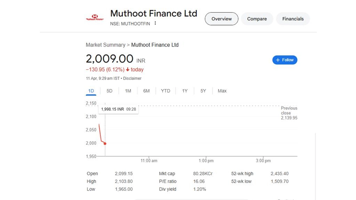 MuthootFin Falls Over 6% to INR 2,009 in Early Trade