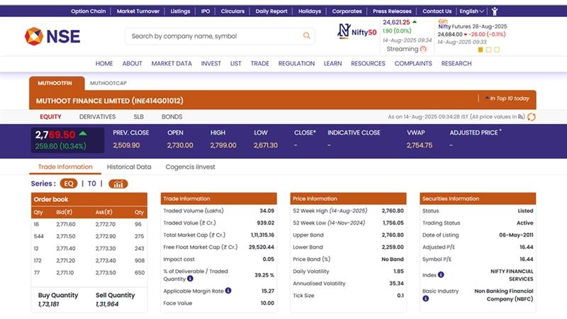Shares of Muthoot Finance Ltd (NSE: MUTHOOTFIN) surged over 10% in early trade on Thursday, August 14, after the company reported its highest-ever quarterly profit. The stock opened at INR 2,730.00 against its previous close of INR 2,509.90 and was trading at INR 2,769.50 by 9:35 AM, up INR 259.60 or 10.34%. The rally came after the gold loan financier announced an 89.6% year-on-year jump in net profit to INR 2,046 crore for Q1 FY26, compared to INR 1,079 crore in the same period last year. This performance marks the strongest quarterly earnings in the company’s history, driven by higher gold loan demand and improved margins. The robust results have boosted investor sentiment, pushing the stock to a fresh 52-week high of INR 2,760.80, well above its 52-week low of INR 1,756.05. Stocks To Buy or Sell Today, August 14, 2025: Muthoot Finance, United Spirits, BPCL and IRCTC Among Shares That May Remain in Spotlight on Thursday.