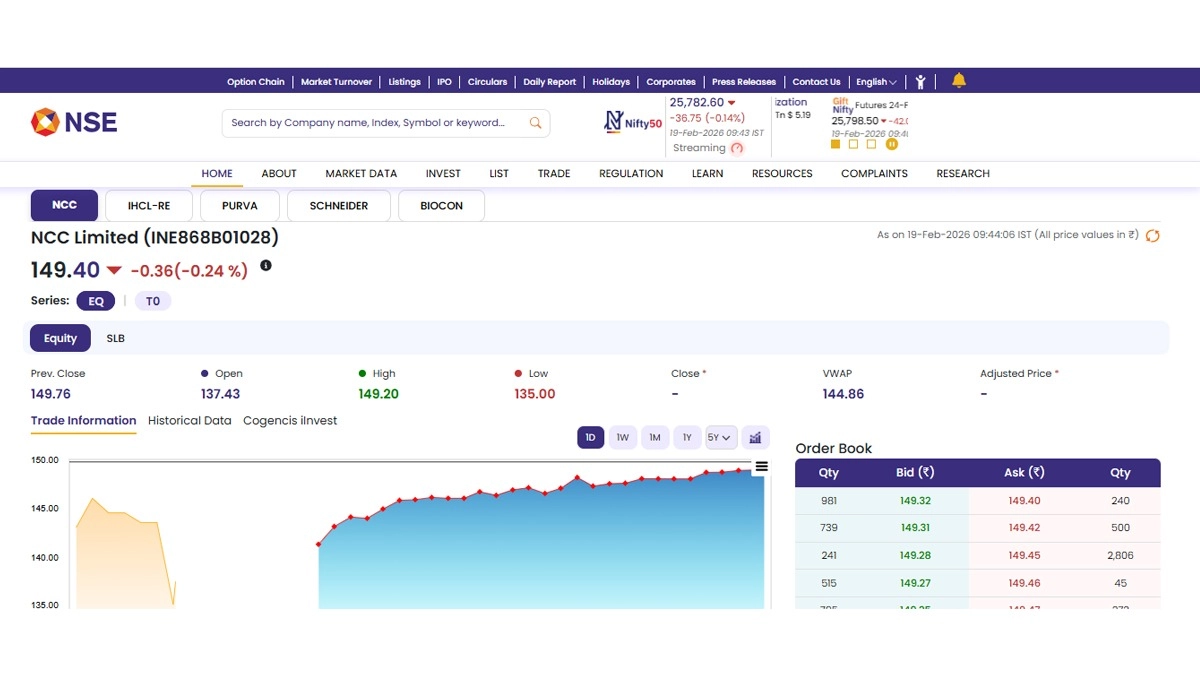 NCC Limited (NSE: NCC) stocks opened on a negative note today, February 19, as soon as the stock market opened for trading. According to the National Stock Exchange (NSE) website, shares of NCC Limited (NSE: NCC) were trading at INR 149.40 and fell by INR 0.36 or 0.24 per cent. Notably, NCC Limited (NSE: NCC) stocks saw their 52-week high of INR 242.15 on June 9 last year and 52-week low of INR 135 today. Stocks To Buy or Sell Today, February 19, 2026: BHEL, RailTel, and NBCC Among Shares That May Remain in Spotlight on Thursday.