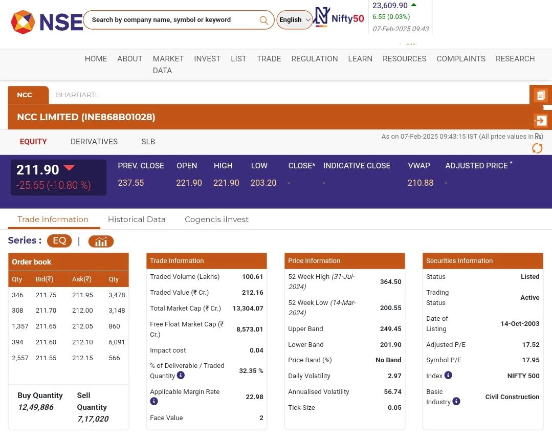 NCC Limited (NSE: NCC) stocks opened in red today, February 7, during early morning trade. As per the National Stock Exchange (NSE) website, NCC Ltd (NSE: NCC) shares were trading at INR 211 and fell by INR 25.65 or 10.80%. Airtel Share Price Today, February 7: Stocks of Bharti Airtel Rise by 3.67% in Early Trade After Q3 Profit Jumps Multifold, Check Latest Price on NSE.