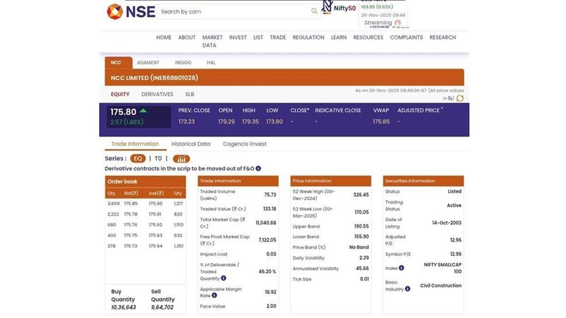 Shares of infra player NCC (NSE: NCC) are in focus after the firm said it has received a Letter of Acceptance dated November 21, 2025, from the Public Works (Health & Education) Department, Assam, for the expansion and modernisation of Gauhati Medical College & Hospital, Guwahati, Assam State. The contract value is INR 2,062.71 crore. On November 25, NCC stock ended on a flat note at INR 173.70 against the previous close of INR 172.25. NCC share has lost 42% in one year and risen 6% in two years. Market cap of the firm stood at INR 10,880 crore. A total of 1.09 lakh shares of the firm changed hands, amounting to a turnover of INR 1.88 crore on BSE. Stocks to Buy or Sell Today, November 26: Adani Enterprises, Reliance Power, and Reliance Industries Limited Among Shares That May Remain in Spotlight on Wednesday.
