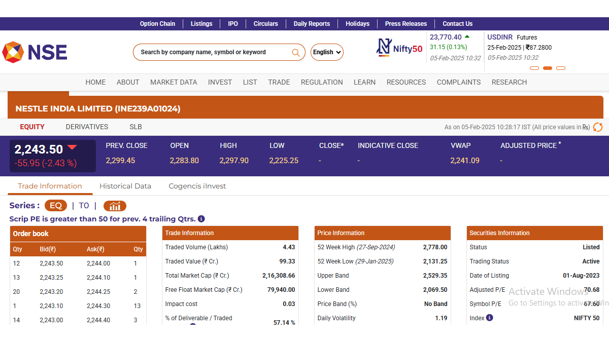 Nestle India Limited (NSE: NESTLEIND) opened on a negative note today, February 5, in the early morning trade. Stocks of Nestle India Limited (NSE: NESTLEIND) were trading at INR 2,243.50 and fell by INR 55.95 or 2.43 per cent. Nestle India Limited (NSE: NESTLEIND) saw its 52-week high of INR 2,778 on September 27 last year. ITC Hotels Share Price Today, February 5: Stocks of ITC Hotels Limited Open in Green on NSE in Early Trade After Being Removed From Sensex and Other BSE Indices.