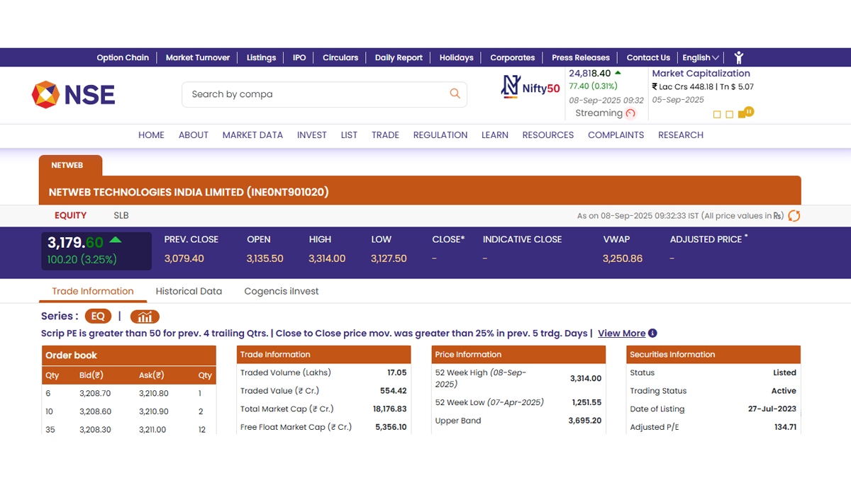 Stocks of Netweb Technologies India Limited (NSE: NETWEB) opened in the green today, September 8, as the stock market opened for business. Shares of Netweb Technologies India Limited (NSE: NETWEB) were trading at INR 3179.60 and saw a growth of INR 100.20 or 3.25 per cent in early trade. Notably, Netweb Technologies India Limited (NSE: NETWEB) stocks saw their 52-week high of INR 3,314.00 today, September 8 and low of INR 1,251.55 on April 7 this year. Stocks To Buy or Sell Today, September 8, 2025: BHEL, Adani Power and SpiceJet Among Shares That May Remain in Spotlight on Monday.