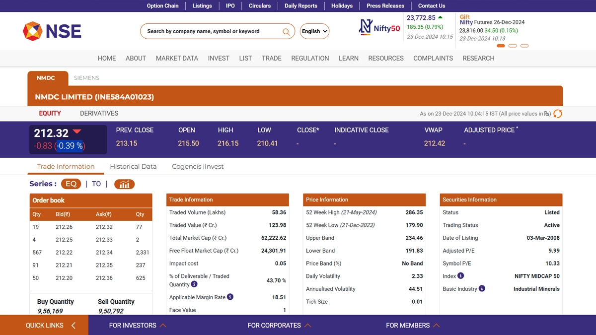 Shares of NMDC Limited (NSE: NMDC) opened at INR 215.20 on Monday, December 23, up from the previous close of INR 213.15. However, in early trade, the stock dipped to INR 212.32, reflecting a decline of 0.39 per cent. The drop comes amid rising concerns over Karnataka's proposal to hike iron ore mining duties, which has weighed on investor sentiment. Till December 19, NMDC's share price dropped by 7.6 per cent. The state-owned enterprise's stock remains under investor scrutiny amid these developments. Siemens India Share Price Today, December 23: Shares of Siemens India Down 0.13% After 10% Fall on Friday.