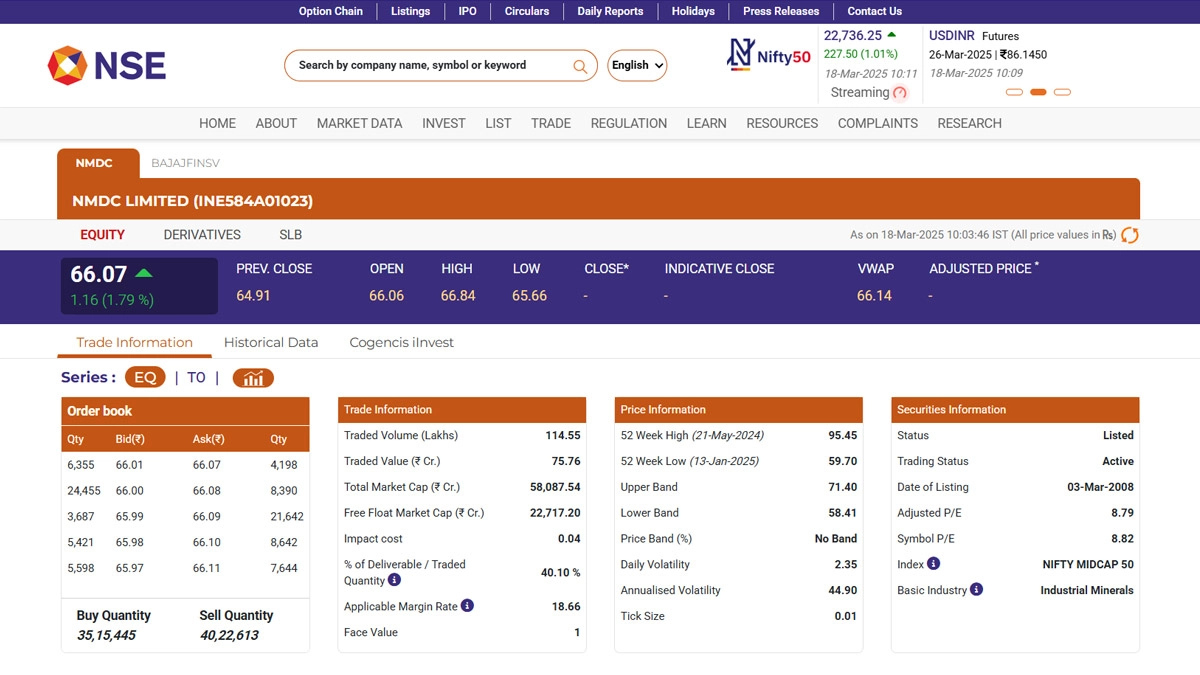 NMDC Ltd (NSE: NMDC) saw its share price rise 1.79 per cent in early trade on March 18, opening at INR 66.06 and climbing to INR 66.07 against the previous close of INR 64.91. The stock gained after the board declared an interim dividend of INR 2.30 per share for FY25, with the record date set for March 21. The state-run mining giant had earlier announced a 2:1 bonus share issuance, boosting investor sentiment. NMDC’s market capitalization currently stands at INR 57,111 crore, with its 52-week high at INR 95.45 and 52-week low at INR 59.70. Bajaj Finserv Share Price Today, March 18: Bajaj Finserv Stock Opens at INR 1,900, Slips As Firm Acquires Allianz SE’s 26% Stake.