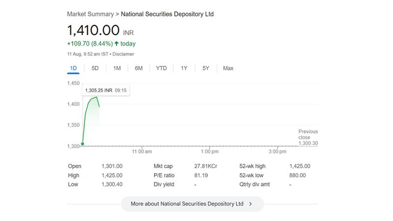 National Securities Depository Ltd (BOM: 544467) shares opened at INR 1,301.00 on Monday, August 11, just above the previous close of INR 1,300.30. By 9:50 AM, the stock surged 8.44% to INR 1,410.00, marking its fourth consecutive day of gains since debuting on August 6. NSDL’s shares have been steadily climbing, hitting a fresh 52-week high of INR 1,425.00 during intraday trade. The stock continues to trade within its price band of INR 1,040.25 to INR 1,560.35, reflecting strong investor interest. This sustained momentum highlights positive market sentiment following the IPO. Stocks To Buy or Sell Today, August 11, 2025: Tata Motors, Manappuram Finance and Voltas Ltd Among Shares That May Remain in Spotlight on Monday.