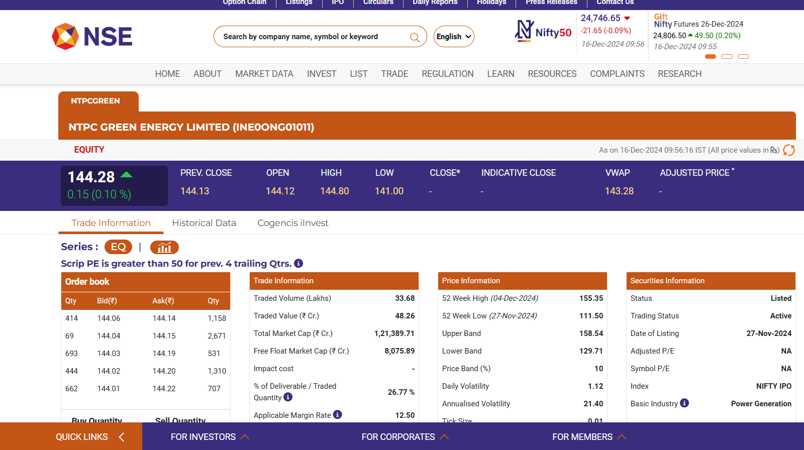 NTPC Green Energy Limited’s (NSE: NTPCGreen) share price opened in the negative on December 16 and is fluctuating between negative and positive territory. At 9:55 AM, NTPC Green share price (NSE: NTPCGreen) was trading at INR 144.28 on the National Stock Exchange (NSE). The stock’s 52-week high stands at INR 155.35, while the 52-week low is INR 111.50. Investors are closely monitoring the stock’s movements amidst market volatility. Stocks To Buy Today, December 16: Ganesh Dongre, Sumeet Bagadia Recommend These Shares To Buy on Monday.