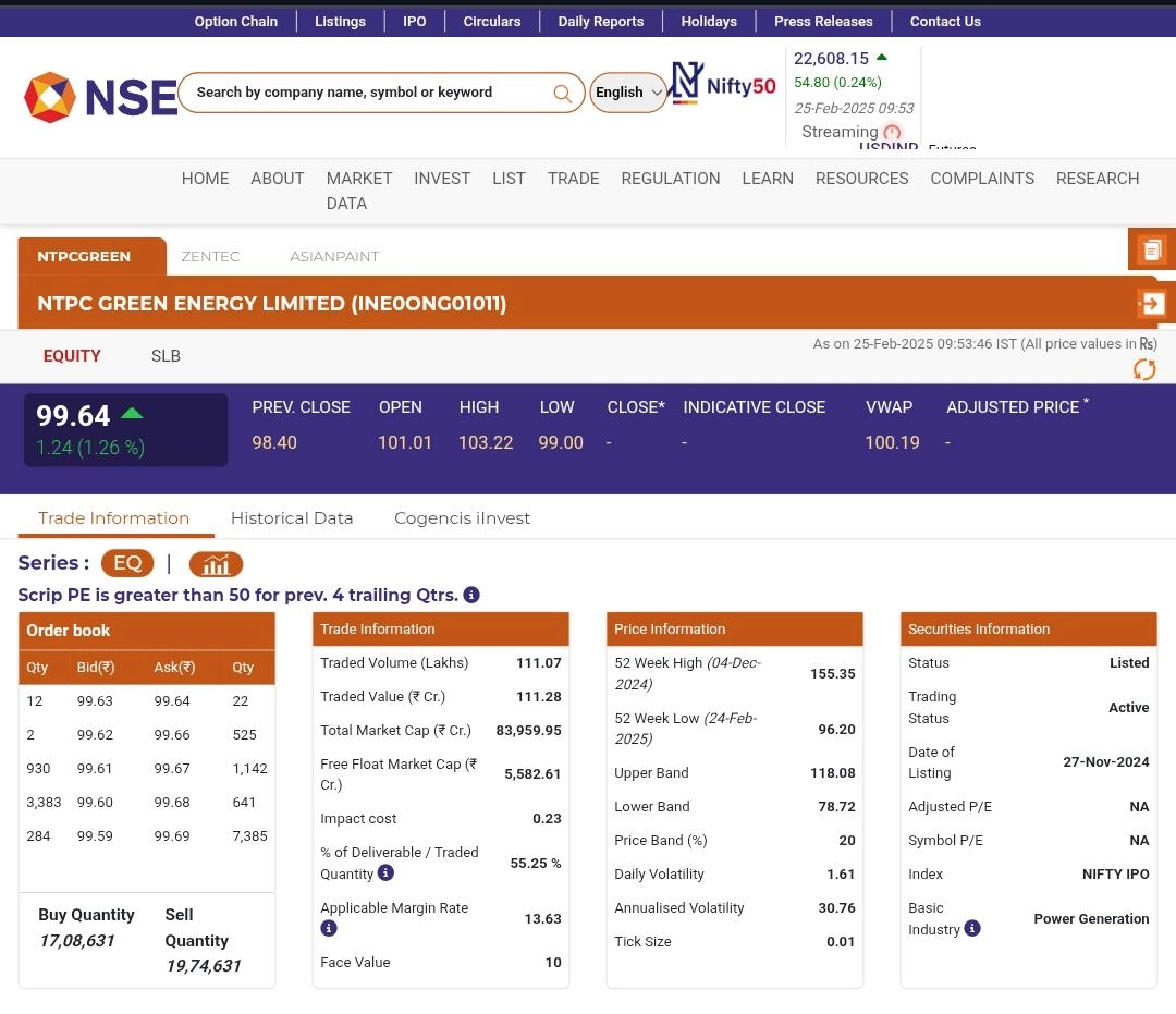 The stock of NTPC Green Energy (NSE: NTPCGREEN) rose by 1.34% on Tuesday morning, February 25. On the second trading day, the price per share of NTPC Green Energy Limited (NSE: NTPCGREEN) was at INR 99.64, up by 1.24. Stocks To Buy or Sell Today, February 25, 2025: Biocon, LIC and NTPC Green Energy Among Shares That May Remain in Focus on Tuesday.