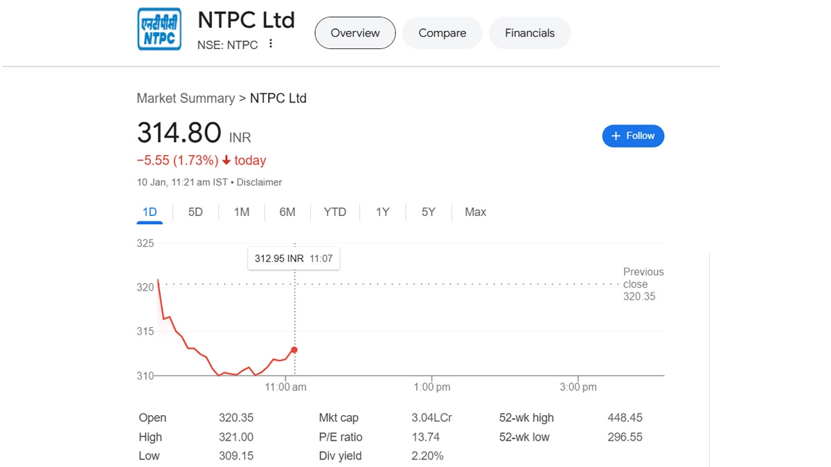 NTPC Ltd’s (NSE: NTPC) share price opened in the negative on January 10, showing fluctuations between gains and losses. At 11:07 AM, NTPC share price (NSE: NTPC) was trading at INR 312.95, down by 2.31% (-INR 7.40) on the National Stock Exchange (NSE). The stock’s 52-week high stands at INR 448.45, while the 52-week low is INR 296.55. The share price opened at INR 320.35, with an intraday high of INR 321.00 and a low of INR 309.15. Stocks To Buy or Sell Today, January 10, 2025: TCS, Adani Wilmar, IREDA and Adani Total Gas Among Shares That Are Likely to Remain in Focus on Friday.