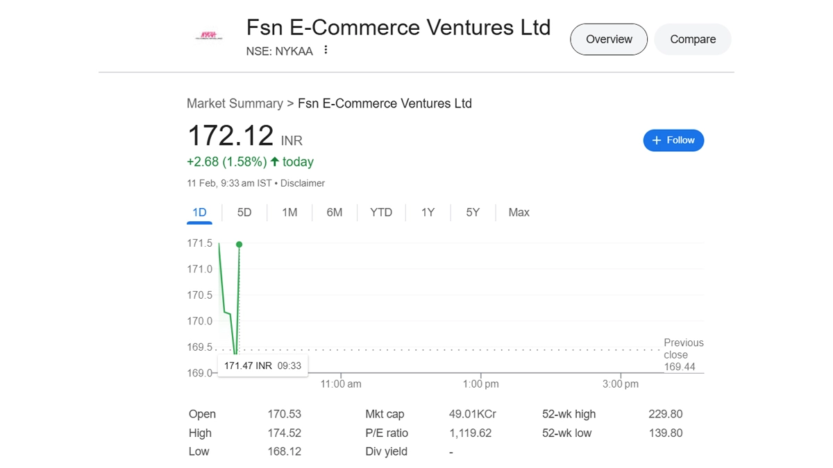 FSN E-Commerce Ventures Limited (NSE: Nykaa) opened positively today. Opened at INR 170.53 on Tuesday and climbed to INR 172.30 by 9:35 AM IST, reflecting a 1.69% increase. The stock recorded an intraday high of INR 174.52 and a low of INR 168.12. Nykaa's market capitalisation currently stands at INR 49,010 crore. Over the past year, the stock has touched a 52-week high of INR 229.80 and a low of INR 139.80. Eicher Motors Share Price Today, February 10: Stocks of Eicher Motors Limited Open in Green in Early Trade, Check Latest Price on NSE.