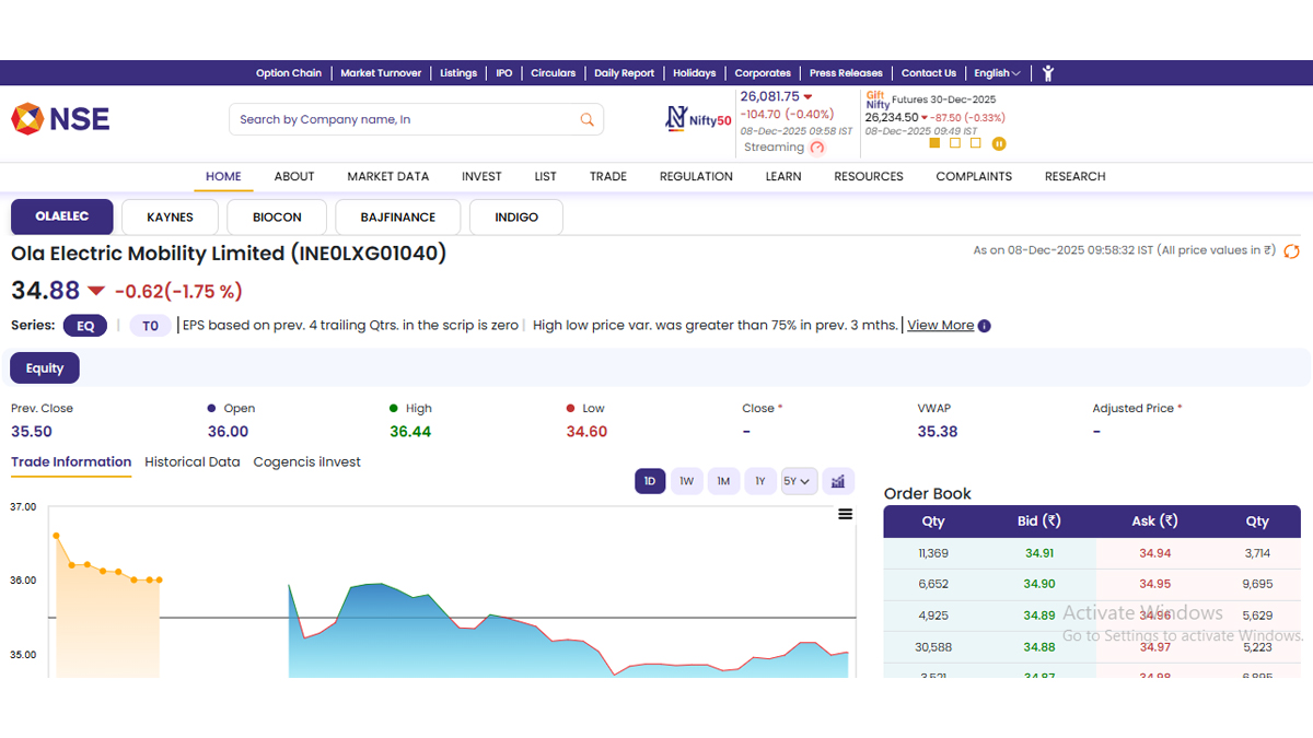 Stocks of Ola Electric Mobility Limited (NSE: OLDELEC) opened on a negative note today, December 8. As per the latest stock market updates and developments, shares of Ola Electric Mobility Limited (NSE: OLDELEC) were trading at INR 34.88 after declining by INR 0.61 or 1.75 per cent in early trade. Stocks of Ola Electric Mobility Limited (NSE: OLDELEC) saw their 52-week high of INR 100.40 on December 17 last year and low of INR 34.60 today, December 8. InterGlobe Aviation Share Price Today, December 8: Stocks of InterGlobe Aviation Limited Fall by INR 200 in Early Trade Amid IndiGo Flight Disruptions, Check Latest Price on NSE.