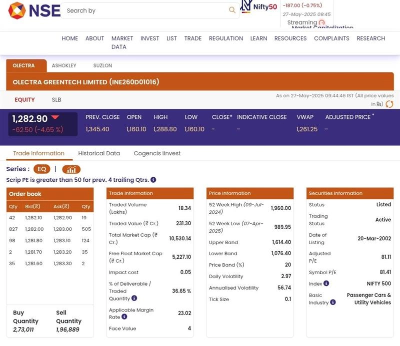 As the Indian stock market opened for trading on Tuesday, May 27, Olectra Greentech Limited (NSE: OLECTRA) stocks opened in the green. According to the National Stock Exchange (NSE), shares of Olectra Greentech (NSE: OLECTRA) were trading at INR 1,282.90 and dropped by INR 62.50 or 4.65 per cent. The fall in Olectra Greentech share price came after Maharashtra's Transport Minister, Pratap Sarnaik, instructed officials to annul the tender granted to the company due to its failure to adhere to delivery schedules. Stocks To Buy or Sell Today, May 27, 2025: Lupin, Sagility, Nazara and Aurobindo Pharma Among Shares That May Remain in Spotlight on Tuesday.