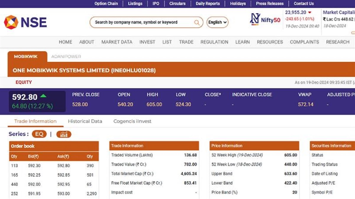 The shares of One Mobikwik Systems Ltd (NSE: MOBIKWIK) opened in green today, December 19, with the stock trading at INR 592.80 in early morning trade. Notably, One Mobikwik Systems Ltd (NSE: MOBIKWIK) saw a gain of INR 64.80 from the previous day's closing of INR 528. The development comes after One Mobikwik was listed with a 58 per cent premium on the National Stock Exchange (NSE). On Wednesday, December 18, the shares of fintech firm One Mobikwik Systems Ltd (NSE: MOBIKWIK) had a dream stock market debut and ended with a huge premium of 90 per cent against the issue price of INR 279. Vishal Mega Mart Share Price Today, December 18: Gurugram-Based Supermarket Chain Makes Stellar Debut on NSE, Listing at INR 104 per Share, Delivers 33% Premium to Its IPO Price.