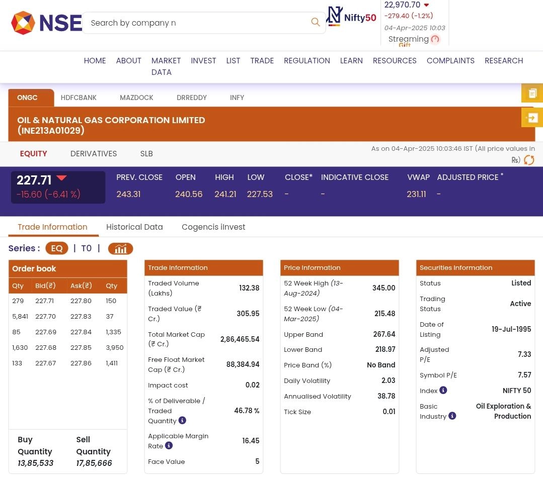 Shares of ONGC (NSE: ONGC) opened on a green note on Friday, April 4, as soon as the stock market opened for business. According to the National Stock Exchange (NSE) website, stocks of ONGC Limited (NSE: ONGC) were trading at INR 227.71 and rose by INR 15.60 or 6.41%. HDFC Bank Share Price Today, April 4: HDFC Bank Limited Stocks Rise by 2.35% in Early Trade, Check Latest Price on BSE and NSE.