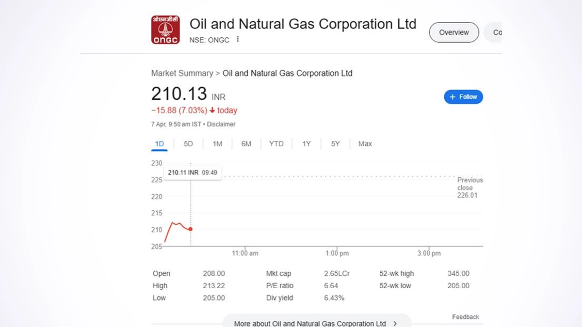 Oil and Natural Gas Corporation Ltd (ONGC) witnessed a sharp decline in its share price during early trading on April 7, dropping by 6.66% to INR 210.96. The stock opened at INR 208.00 and quickly slid to an intraday low of INR 205.00 — matching its 52-week low. The day’s high stood at INR 213.22. Reliance Share Price Today, April 7: Stock of Reliance Industries Falls Over 4% in Early Trade, Check Latest Price on NSE.
