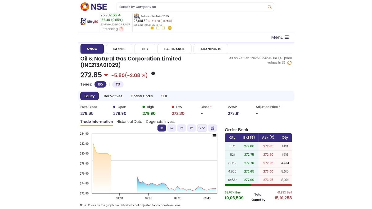 ONGC Limited (NSE: ONGC) stocks opened on a negative note today, on Monday, February 23, as soon as the stock market opened for trading. According to the National Stock Exchange (NSE) website, shares of ONGC Limited (NSE: ONGC) were trading at INR 272.85 and fell by INR 5.80 or 2.08 per cent. Earlier, the Public Enterprises Selection Board (PESB) has recommended Shri Satyan Kumar for the post of Director (Strategy & Corporate Affairs) at Oil & Natural Gas Corporation Limited (ONGC), a Schedule 'A' Central Public Sector Enterprise. The recommendation was made during the PESB meeting No. 13/2026 held at 08:45 AM on February 20. Stocks to Buy or Sell Today, February 23, 2026: NTPC Green, Bharti Airtel, L&T Among Shares Likely to Remain in Spotlight on Monday.