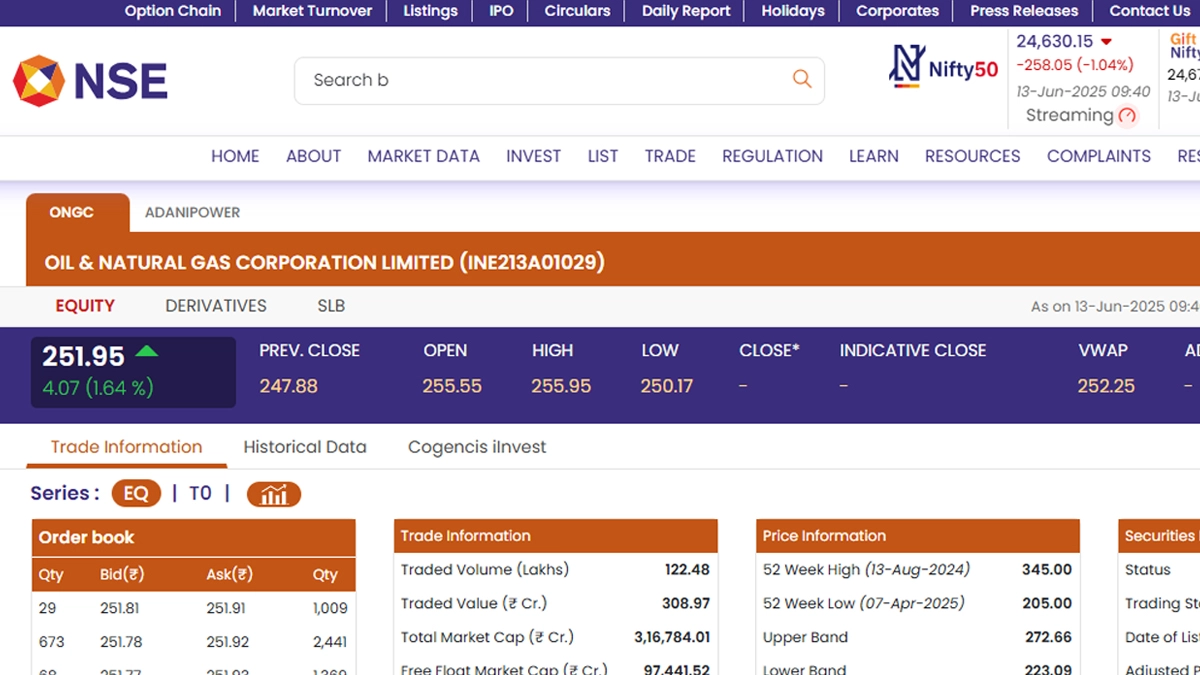 Stocks of Oil & Natural Gas Corporation Limited (NSE: ONGC) opened in green today, June 13, as soon as the stock market opened for business. According to the National Stock Exchange (NSE) website, shares of Oil & Natural Gas Corporation Limited (NSE: ONGC) were trading at INR 251.95 and rose by INR 4.07 or 1.64 per cent. Notably, stocks of Oil & Natural Gas Corporation Limited (NSE: ONGC) saw their 52-week high of INR 345 on August 13 last year and 52-week low of INR 205 on April 7, 2025. Stocks To Buy or Sell Today, June 13, 2025: Torrent Power, HCLTech, Canara Bank Among Shares That May Remain in Focus on Friday.