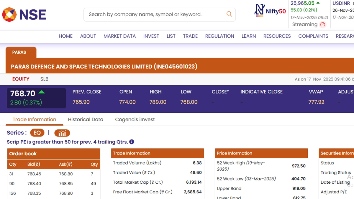 Stocks of Paras Defence and Space Technologies Limited (NSE: PARAS) opened in green today, November 17, as soon as the stock market opened for business. Shares of Paras Defence and Space Technologies Limited (NSE: PARAS) were trading at INR 768.70 in early trade. Notably, stocks of Paras Defence and Space Technologies Limited (NSE: PARAS) rose by INR 2.80 or 0.37 per cent. It is worth noting that Paras Defence and Space Technologies Limited (NSE: PARAS) shares saw their 52-week high of INR 972.50 on May 19 this year and low of INR 404.70 on March 3. Stocks to Buy or Sell Today, November 17, 2025: Maruti Suzuki, Lupin and Kotak Mahindra Bank Among Shares That May Remain in Spotlight on Monday.