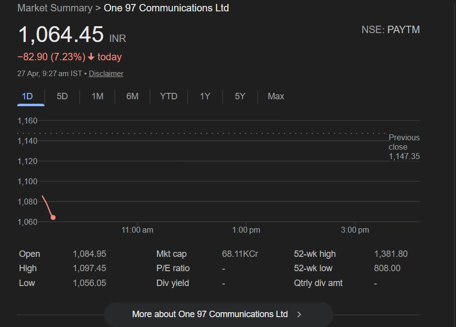Shares of One 97 Communications Ltd (NSE: Paytm) fell sharply on April 27, 2026, with the stock dropping 7.25% to INR 1,064.15 in early trade. The decline follows a major regulatory action by the Reserve Bank of India, which cancelled the banking licence of Paytm Payments Bank over non-compliance with regulatory norms. The central bank stated that the bank’s operations were detrimental to depositors’ interests and failed to meet licence conditions. RBI also confirmed it will initiate winding-up proceedings by approaching the High Court. The development has raised fresh concerns over Paytm’s regulatory challenges and weighed heavily on investor sentiment. Stocks To Buy or Sell Today, April 27, 2026: Reliance Industries, Axis Bank and Lodha Developers Among Shares That May Remain in Spotlight on Monday.