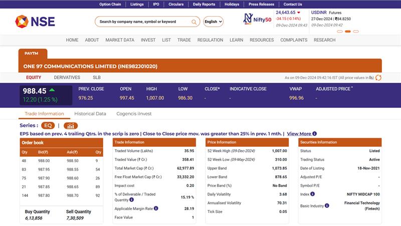 Shares of Paytm, listed under NSE: Paytm, saw a boost today, December 9, opening at INR 988.45 on the NSE, marking a 1.25 per cent increase from its previous close of INR 976.25. The uptick follows the announcement of a deal between Paytm's parent company, One97 Communications Ltd., and SoftBank. The deal involves selling a 5.4 per cent stake in Japan’s digital payments giant PayPay Corp., valued at approximately USD 280 million (INR 2,364 crore). After the news broke, Paytm’s stocks surged over 3 per cent, reflecting investor optimism about the deal. Paytm Parent Firm One97 Communications Approves Sale of Stake Valued Around INR 2,000 Crore in PayPay Corporation.