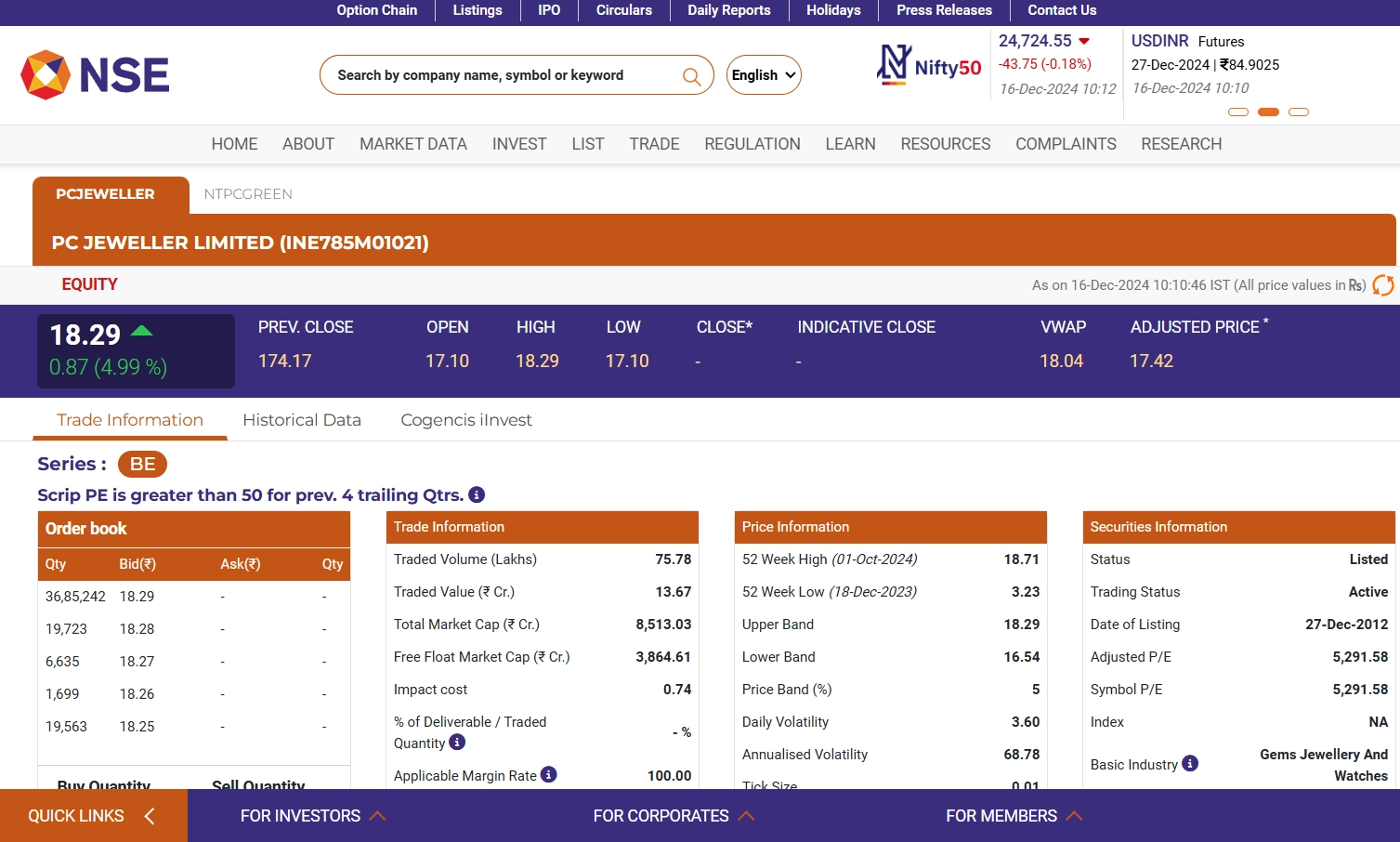 PC Jeweller share price (NSE: PCJeweller) gained significant investor attention on December 16, 2024. PC Jewellers share price (NSE: PCJeweller) was trading at 18.29 at 10:15 AM , an increase of INR 0.87 or 4.99% from the previous session. The stock opened at INR 17.10, touched a high of INR 18.29, and maintained a low of INR 17.10 during the trading session till 10:15 AM. With a trading volume exceeding 7.24 million shares, investor activity was robust, reflecting optimism after the recent price surge. PC Jeweller’s market capitalisation now stands at approximately INR 987 crore, affirming its position in the gems and jewellery sector. The stock’s upward movement highlights growing interest, with analysts recommending careful evaluation of market trends before deciding whether to buy, hold, or sell. Stocks To Buy Today, December 16: Ganesh Dongre, Sumeet Bagadia Recommend These Shares To Buy on Monday.