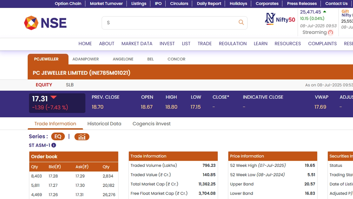 Stocks of PC Jeweller Limited (NSE: PCJEWELLER) opened on a negative note today, July 8, as soon as the stock market opened for business. Shares of PC Jeweller Limited (NSE: PCJEWELLER) were trading at INR 17.31 and declined by INR 1.39 or 7.43 per cent. Stocks of PC Jeweller Limited (NSE: PCJEWELLER) saw their 52-week high of INR 19.65 on Monday, July 7 and 52-week low of INR 5.51 on July 8 last year. Stocks To Buy or Sell Today, July 08, 2025: Titan, IndusInd Bank and Adani Wilmar Among Shares That May Remain in Spotlight on Tuesday.