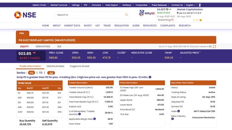 Shares of PG Electroplast Ltd (NSE: PGEL) opened at INR 559.35 on Monday, August 11, down from the previous close of INR 588.80, reflecting ongoing bearish sentiment. By 10:10 AM, the stock plunged further by 14.43%, trading at INR 503.85 amid heavy selling pressure. This sharp decline extends the losing streak that began on Friday, when the stock crashed nearly 23%, marking the steepest single-day fall in the company’s history. The sell-off followed disappointing Q1 financial results and a significant downward revision of the full-year guidance, shaking investor confidence. The stock now trades closer to its lower price band of INR 471.05, far from its 52-week high of INR 1,054.20 hit earlier this year. NSDL Share Price Today, August 11: NSDL Stock Climbs to INR 1,410, Extending Gains for 4th Consecutive Session Since IPO Debut.