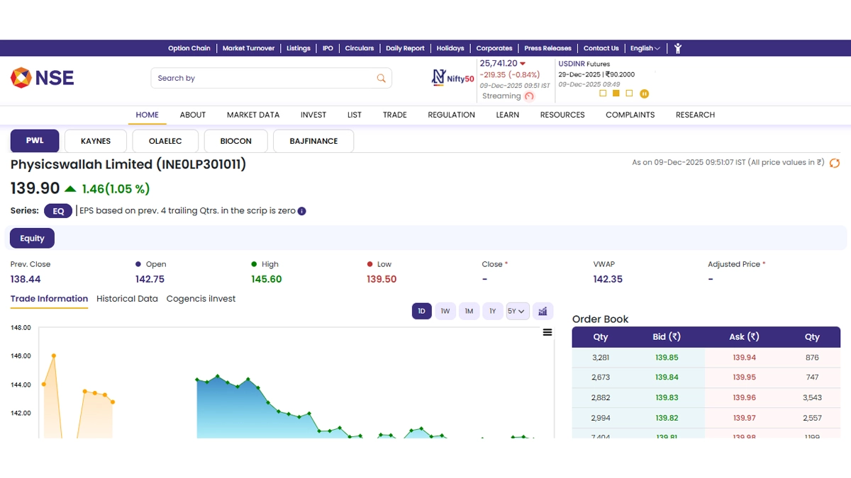 The shares of Physicswallah Limited (NSE: PWL) opened in green today, December 9, as soon as the stock market opened for business. Stocks of Physicswallah Limited (NSE: PWL) were trading at INR 139.90 and rose by INR 1.46 or 1.05 per cent. It is worth noting that shares of Physicswallah Limited (NSE: PWL) saw their 52-week high and low of INR 161.99 and INR 121.22 on November 18 and November 20 this year. Kaynes Technology Share Price Today, December 9: Stocks of Kaynes Technology India Limited Open on Positive Note, Check Latest Price on NSE.