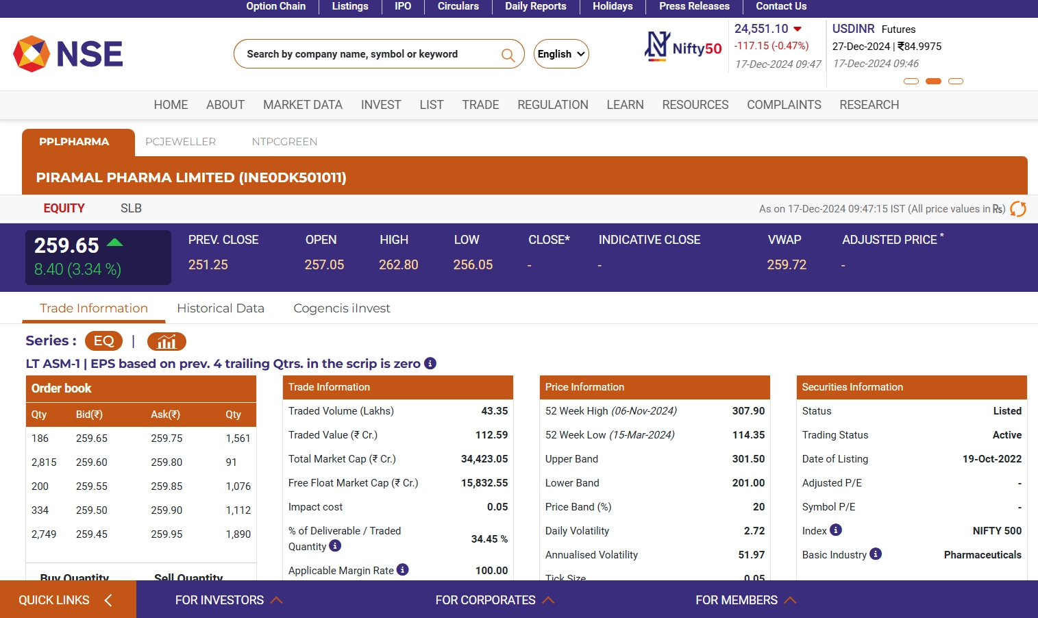 Piramal Pharma share price traded in the green on December 17, reaching INR 259.65 at 9:50 AM. The stock is currently trading at 21x FY26 EV/EBITDA and 17x FY27 EV/EBITDA, reflecting a 38% discount compared to its listed peers. Investors are closely watching this valuation gap, as the stock shows potential for growth relative to its industry counterparts. Stocks To Buy Today, December 17: Kalyan Jewellers, Prestige Estates, Oberoi Realty Among Recommended Shares To Buy on Tuesday.