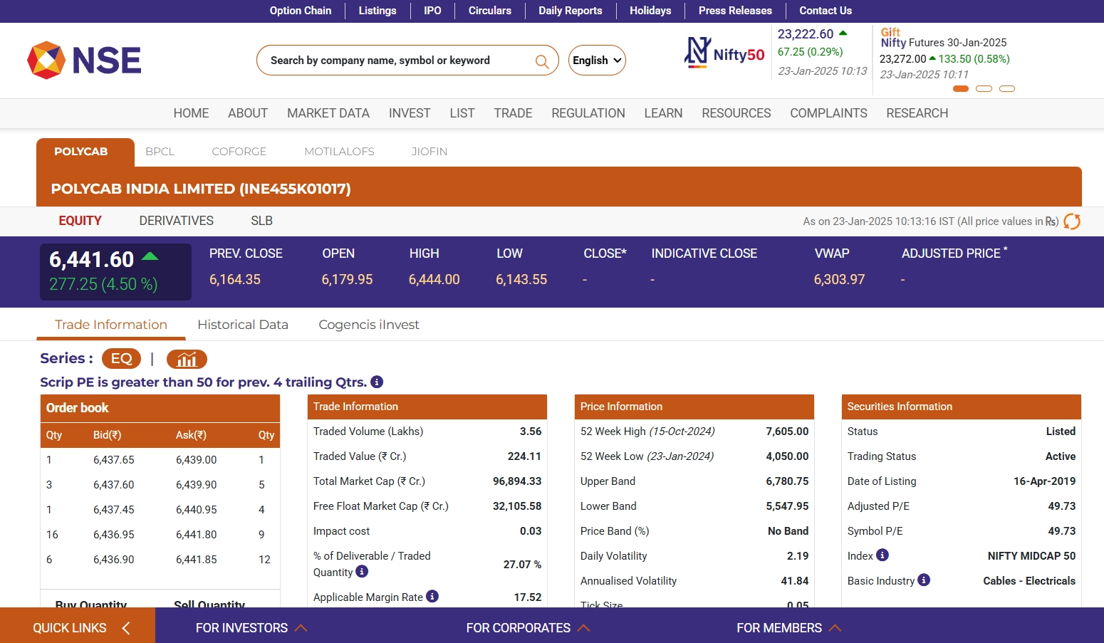 Polycab India Limited’s share price (NSE: Polycab) has seen a notable increase today, January 23, reaching INR 6,447.80 on the NSE, up by 4.60% (+INR 283.45) as of 10:15 am IST. This positive movement comes ahead of the company’s Q3 earnings call, scheduled for 12:00 pm IST, where investors are expected to gain insights into Polycab’s financial performance and future growth prospects. The stock’s rise reflects market optimism about the company’s continued strength in the electrical goods and wire manufacturing sector. Stocks To Buy or Sell Today, January 23, 2025: Hindustan Unilever, BPCL and Gravita India Among Shares That May Remain in Focus on Thursday.