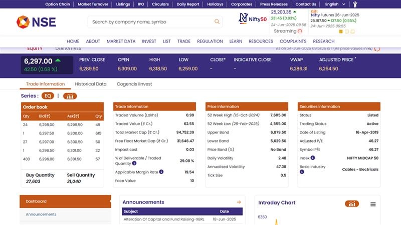 Polycab India Ltd (NSE: POLYCAB) shares opened at INR 6,309.00 on Tuesday, June 24, slightly higher than the previous session’s close of INR 6,289.50. By 9:55 AM, the stock was trading at INR 6,297.00, up by 0.68% or INR 42.50. The gain follows a nearly 5% rally on June 23, when the stock hit a five-month high. The rally was triggered by a bullish report from global brokerage Jefferies, which highlighted Polycab’s strong performance and market share gains in the previous fiscal year. The stock's 52-week high stands at INR 7,605.00 (October 15, 2024), while the low is INR 4,555.00 (February 28, 2025). Stocks To Buy or Sell Today, June 24, 2025: Tata Motors, Larsen & Toubro and Allcargo Logistics Among Shares That May Remain in Focus on Tuesday.