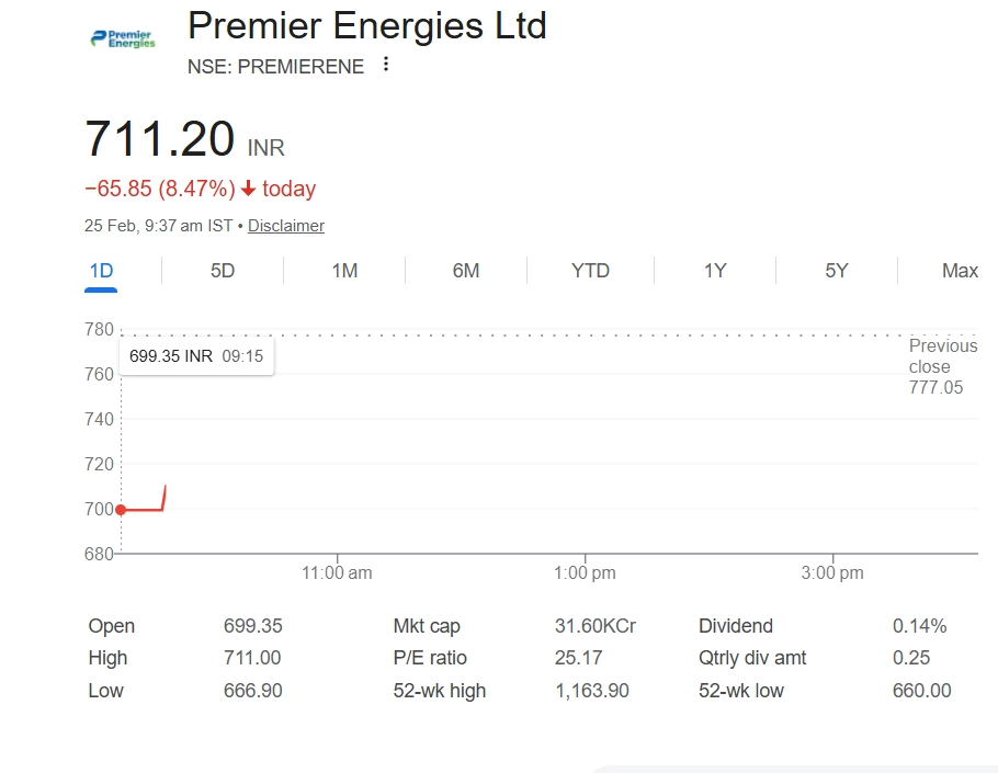 Shares of Premier Energies Ltd (NSE: PREMIERENE) opened sharply lower on Wednesday, with the stock quoted around INR 720.95 at 9:39 am IST, down INR 56.10 or 7.21 percent from the previous close. The broader solar and renewable energy segment remained in focus after fresh trade duties on solar imports added pressure to sector valuations. Investors are watching stock movements closely amid shifting global solar demand and domestic market volatility as the company’s fundamentals and outlook evolve. When Will IT Share Prices Rise in NSE and BSE in 2026?